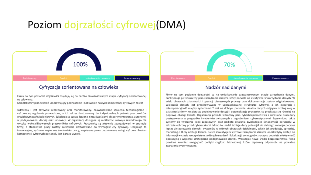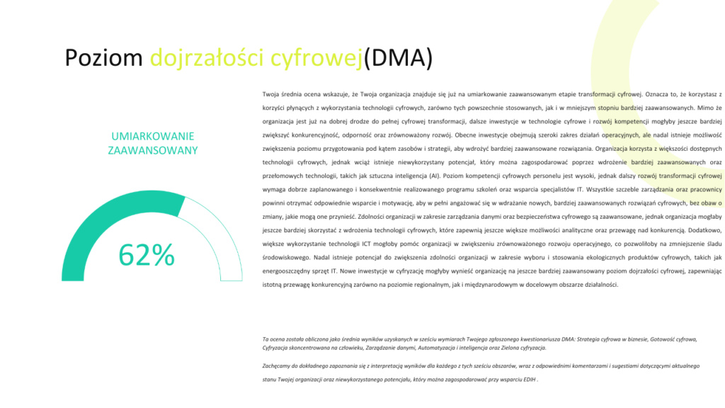 Badanie DMA (Digital Maturity Assessment) to zaawansowany europejski standard oceny dojrzałości cyfrowej firm. Analizuje sześć kluczowych obszarów cyfryzacji — od strategii biznesowej, przez zarządzanie danymi, aż po automatyzację i zieloną transformację — i pokazuje, jak przedsiębiorstwo wypada na tle rynku.