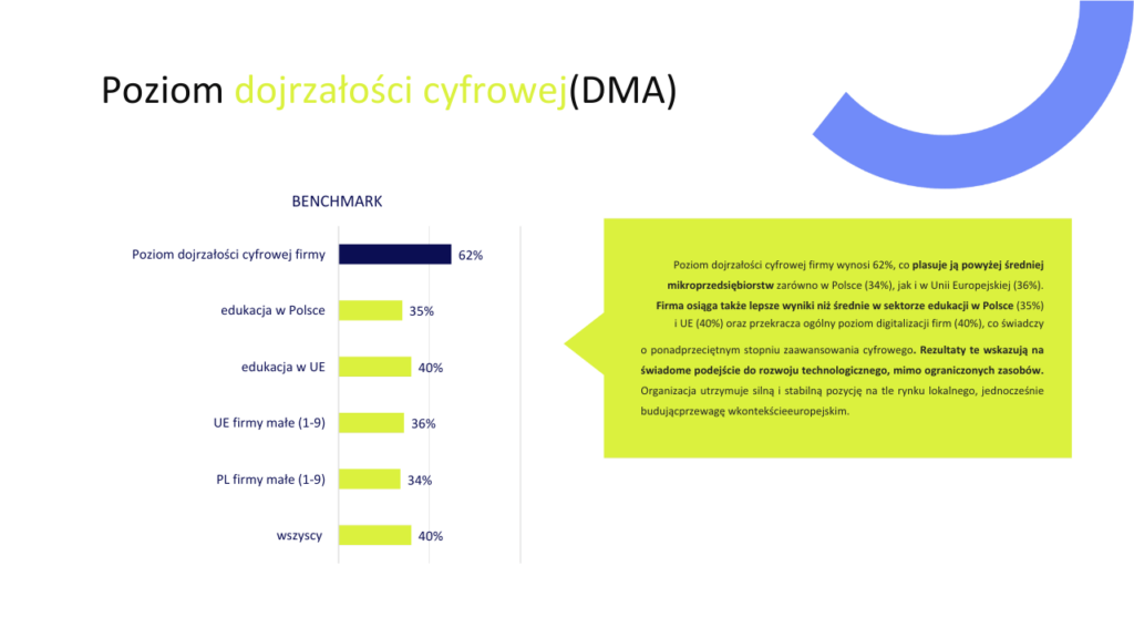 W Quali przeszliśmy to badanie wiosną 2025 roku, uzyskując 62%, co oznacza poziom umiarkowanie zaawansowany i jednocześnie stawia nas daleko powyżej średniej polskich mikroprzedsiębiorstw (34%) oraz średniej unijnej (36%). To wyjątkowe osiągnięcie w skali kraju — zwłaszcza w sektorze edukacji, gdzie średni poziom cyfryzacji jest znacznie niższy.